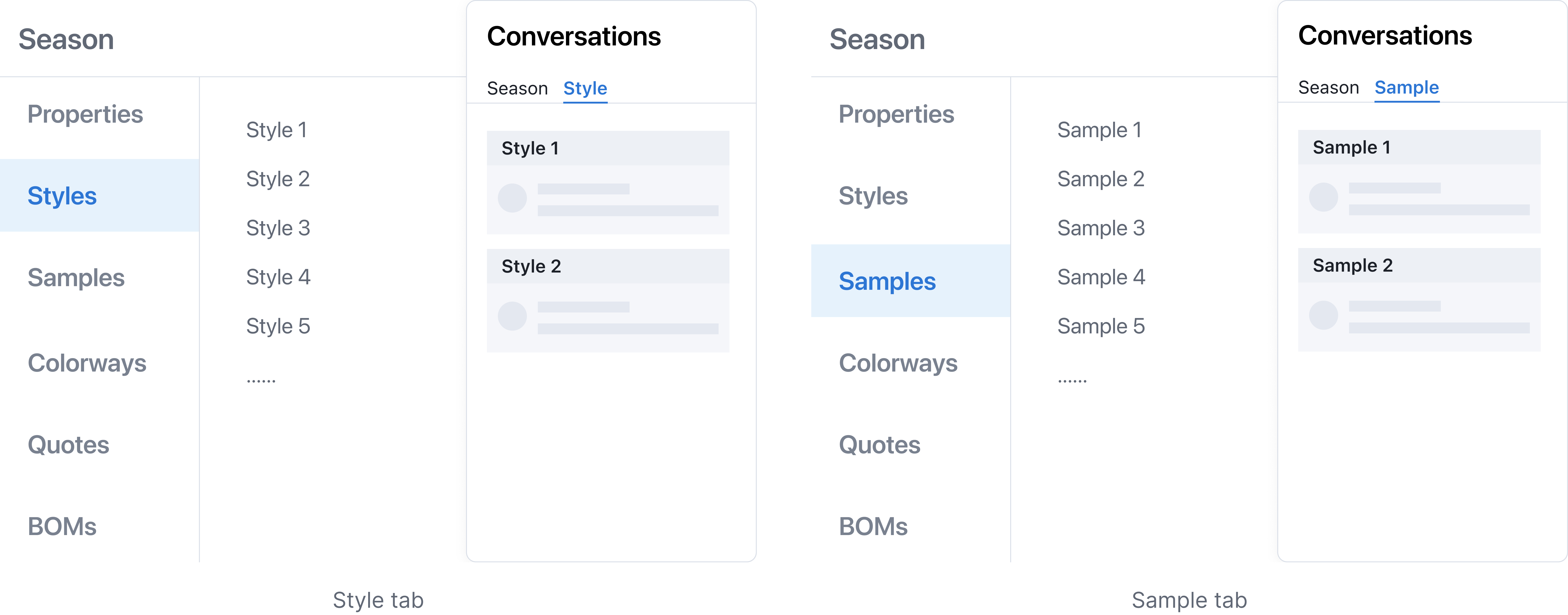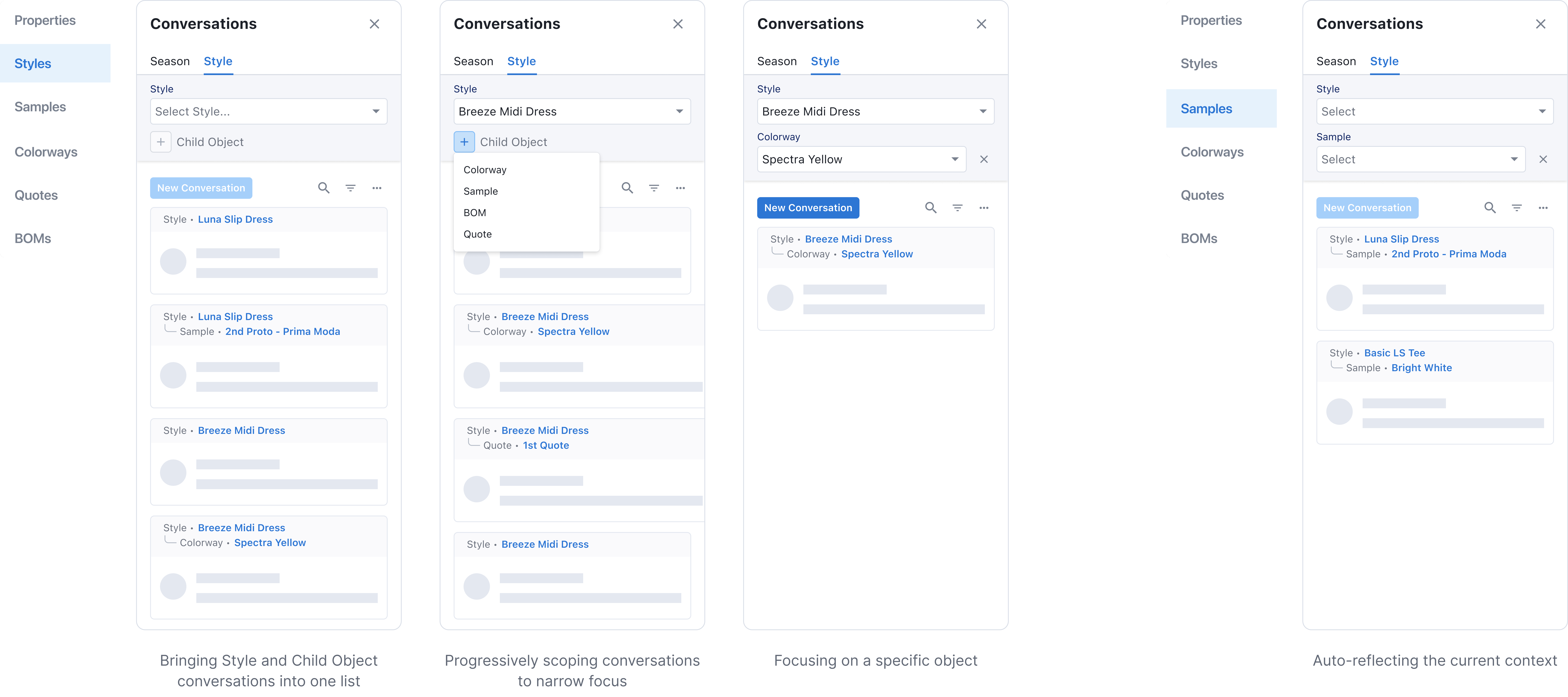 I designed the conversation panel to adapt to the active object domain, so users always see conversations in the context of what they are currently working on, rather than navigating a fixed hierarchy.